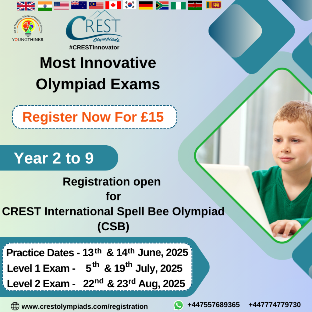 CREST International Spell Bee & Vocabulary Olympiad is a Unique one of its kind Global Online Spelling Assessment for Year 2 To 9, evaluating students on meaning, spelling, and pronunciation in British English to foster their lexical development
