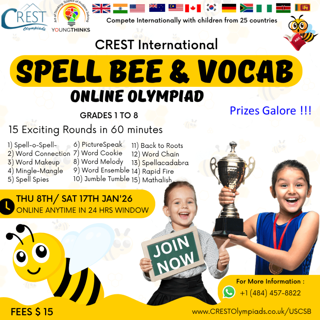 Students of Grades 1 to 8 can participate in the CREST International Spell Bee & Vocabulary Olympiad.